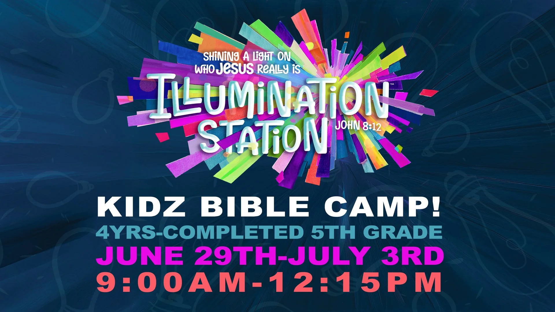 This summer we invite our kids to “Illumination Station” for the brightest week of the year! While many people claim to know about Jesus, many are in the dark about who He really is. During Bible Camp our kids will explore all the ways light brightens, illuminates, reflects, and reveals.